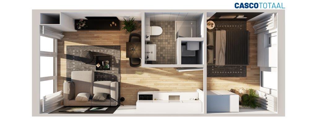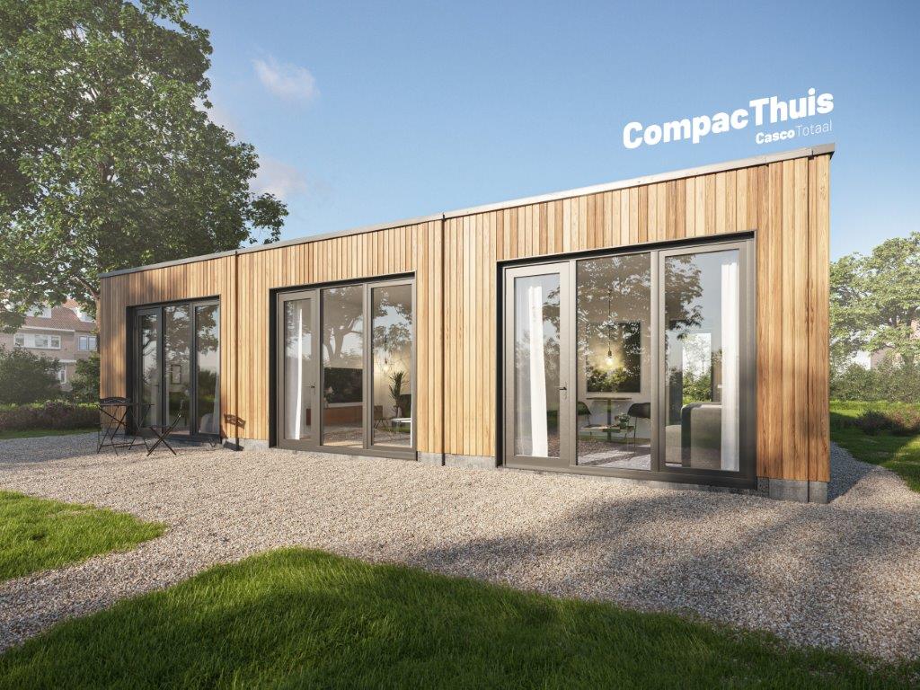Voor een optimale woonbeleving is gekozen voor een zo efficiënt mogelijke indeling. Een CompacThuis bestaat uit een woongedeelte met keuken, een badkamer inclusief toilet en een aparte slaapkamer. De wind- en waterdichte versie van CompacThuis kan op de bouwplaats verder worden afgebouwd.