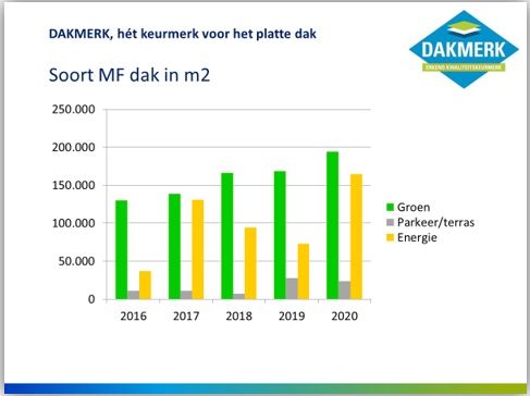 De groei van het aantal vierkante meters groendak zet ook in 2020 stevig door. Onder een groendak worden niet alleen daktuinen verstaan, maar ook natuurdaken, sedumdaken en daken die in combinatie met het groen water opvangen. De bij DAKMERK aangesloten dakaannemers realiseerden gezamenlijk 195.000 m2 groendak. Een toename van ruim 15% ten opzichte van een jaar eerder.