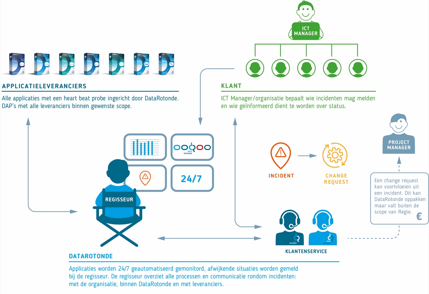 In alle gevallen wordt het incident geïnterpreteerd, in sommige gevallen voeren we een probleemdiagnose uit om vervolgens alle betrokken partijen te informeren en acties uit te zetten. DataRotonde neemt de regie over de uitgezette acties (mandaat noodzakelijk) en zorgt ervoor dat de organisatie altijd op de hoogte is van de status. Mocht er een wijzigingsverzoek voortkomen uit een signalering dan heeft DataRotonde in de meeste gevallen ook de juiste