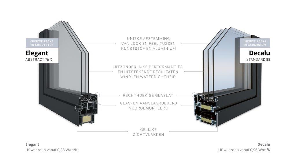Het unieke Decalu concept bestaat uit één binnenkader met gelijke middensectie en een geïntegreerde thermische isolatie in de profielen. Dit systeem bestaat uit slechts 3 componenten zonder centrale middendichting. Zo wordt de productietijd per raam met 50% gereduceerd. Bovendien werkt Deceuninck niet met verschillende Uf-waarden, men koos voor een minimale Uf-waarde voor de hele reeks, vanaf 0.96 W/m²K.