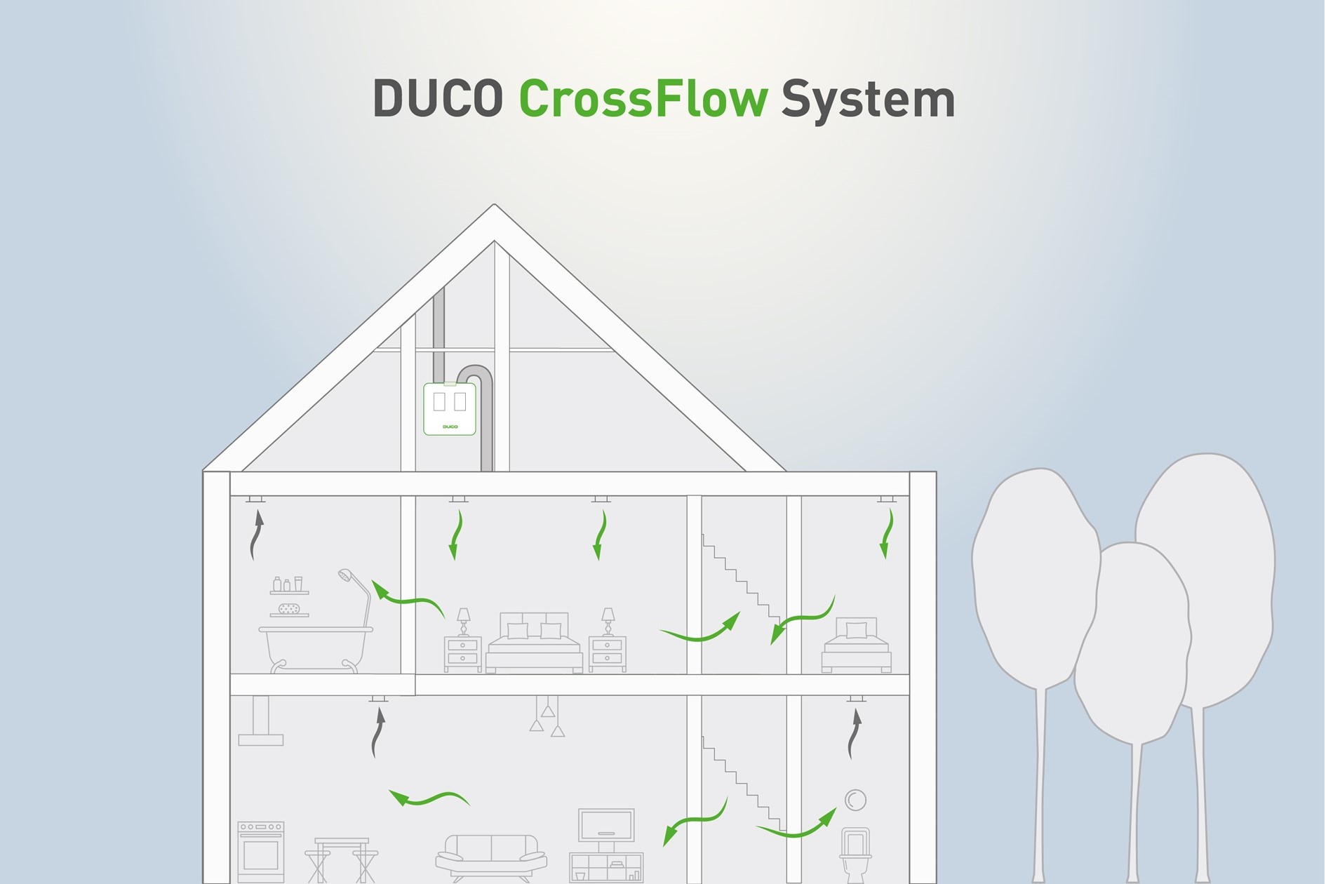 Het Duco CrossFlow System is gebaseerd op het principe dat slaapvertrekken en leefvertrekken nooit tegelijk in gebruik zijn. Verse lucht wordt via de slaapkamers toegevoerd en stroomt overdag via de hal door naar de woonkamer. Vervuilde lucht wordt afgevoerd via natte ruimtes, zoals keuken, toilet en badkamer. Door deze slimme luchtcirculatie zijn aparte toevoerleidingen naar de woonkamer niet nodig. Dit betekent minder leidingen, minder warmteverlies en meer installatiegemak.