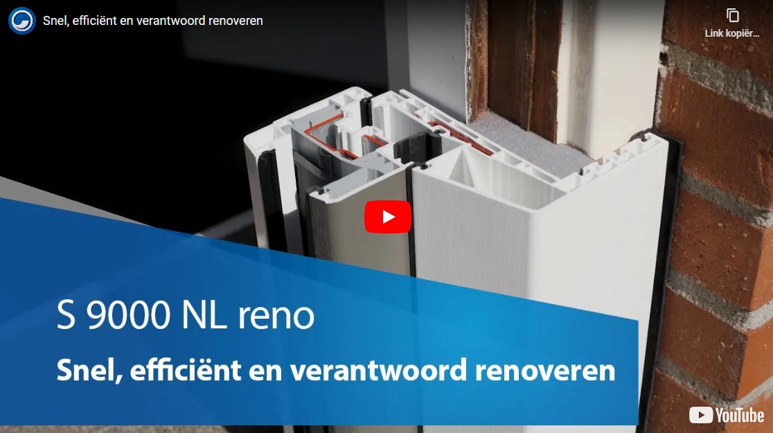 Het S 9000 NL reno systeem is speciaal ontwikkeld voor renovatiedoeleinden. Doordat het oude kozijnkader niet verwijderd wordt, is er sprake van een enorme afvalreductie. Het bestaande kader wordt ingepakt, waardoor eventueel asbest vaak niet verwijderd hoeft te worden. Een stelkozijn is niet nodig en de kans op beschadigingen is aanzienlijk kleiner.