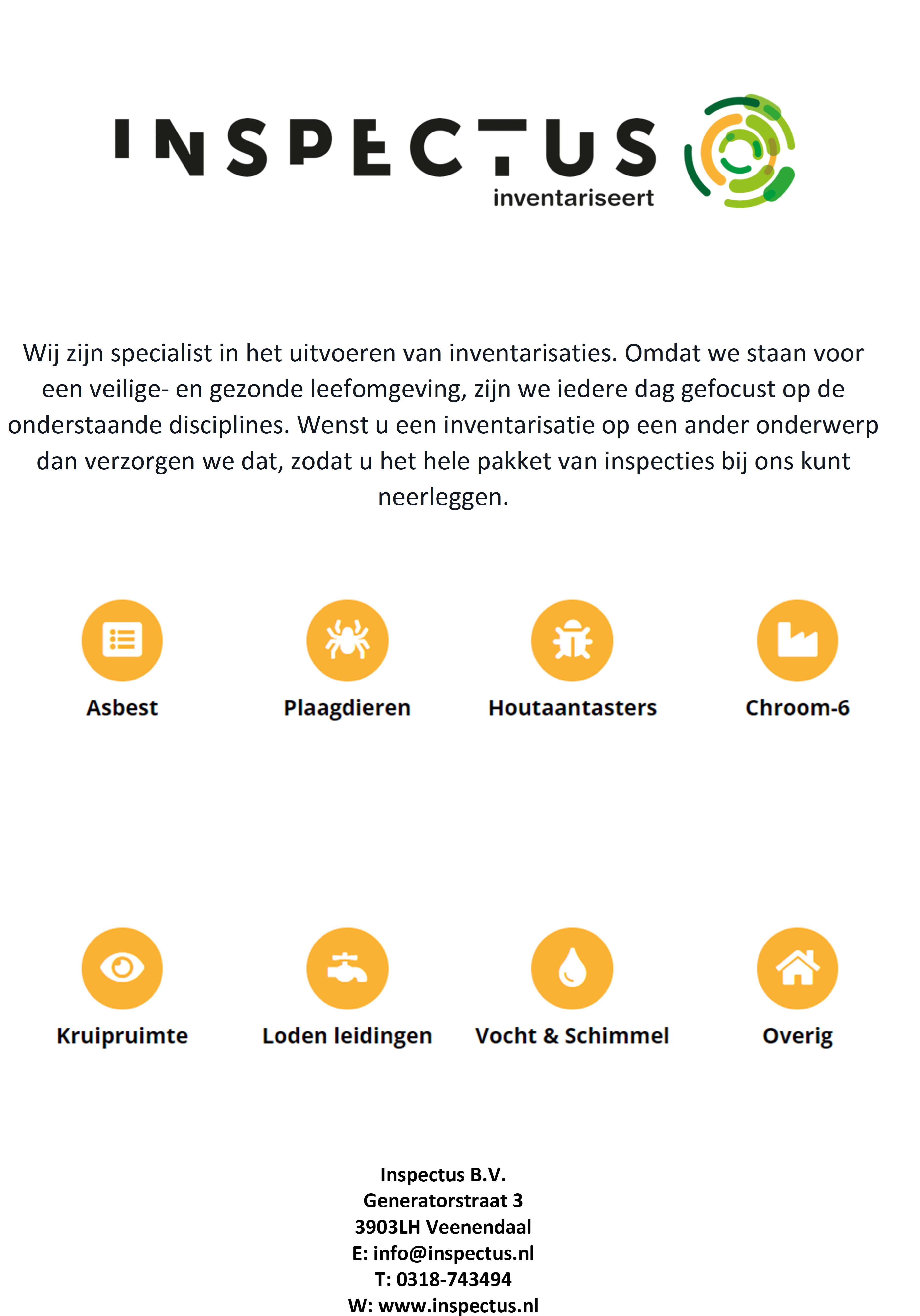 Inspectus beschikt over een team van inspecteurs met jarenlange ervaring die het als een uitdaging zien om de eventueel aanwezige plaagdieren, en de risico’s daarvan, volledig in kaart te brengen. Vervolgens geven zij u het juiste advies om ermee aan de slag te gaan.
