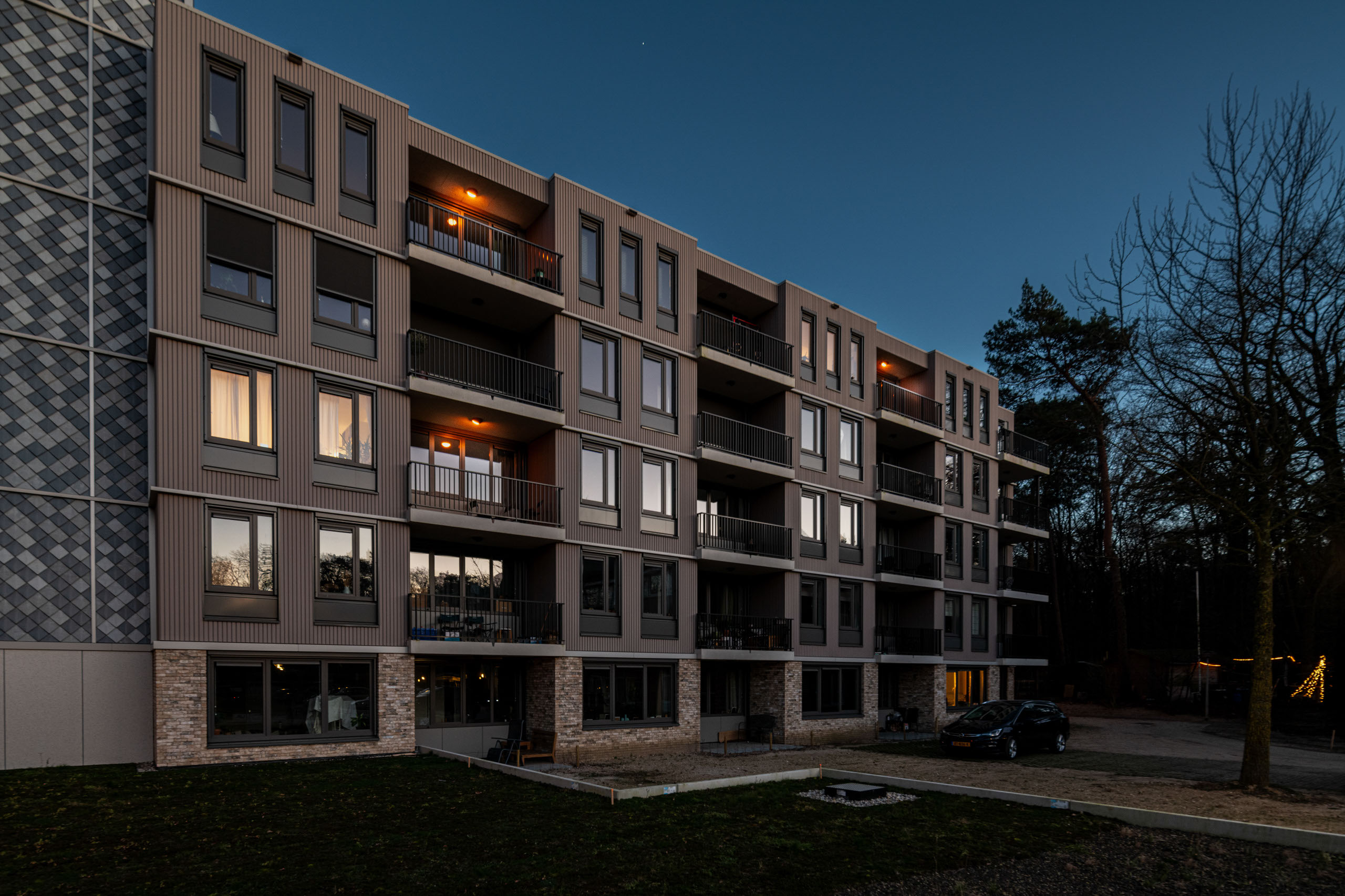 In Berg en Dal is het voormalige woonzorgcentrum Vijverhof duurzaam getransformeerd naar 72 appartementen. Eén van de uitdagingen voor installateur Ventimon was de buitenverlichting omdat de plek waar het pand staat, ook leefgebied is van veel vleermuizen. Lightronics kreeg de vraag het bestaande DOTT H-armatuur door te ontwikkelen en te voorzien van amberkleurige LED-verlichting. Eerder was al gekozen voor armaturen uit de DOTT-familie voor binnen-toepassingen – denk hierbij aan de gangen in het woongebouw. Omdat de DOTT H ook nog voorzien kan worden van een afscherming – zodat er gericht licht ontstaat, was dit een voor de hand liggende keuze. De bewoners kunnen de armaturen wel individueel aansturen. Tot slot is de vluchtweg voorzien van TPN LED-noodverlichtingsarmaturen, ook voorzien van de amberkleurige LED’s.