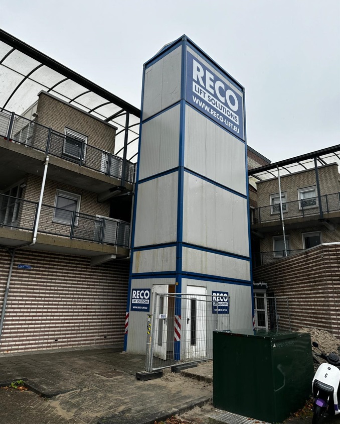 De woningcorporatie die de zorgwoningen beheert heeft op tijd RECO Lift Solutions benaderd om een tijdelijke noodlift te plaatsen voor de bewoners. RECO Lift Solutions is specialist in tijdelijke liften en heeft voor vrijwel elke situatie een geschikte lift. In dit geval is gekozen voor een ruime RECO Personenlift. Deze liften bieden genoeg ruimte voor scootmobielen en andere hulpmiddelen en hebben op elke verdieping een overdekte wachtruimte.