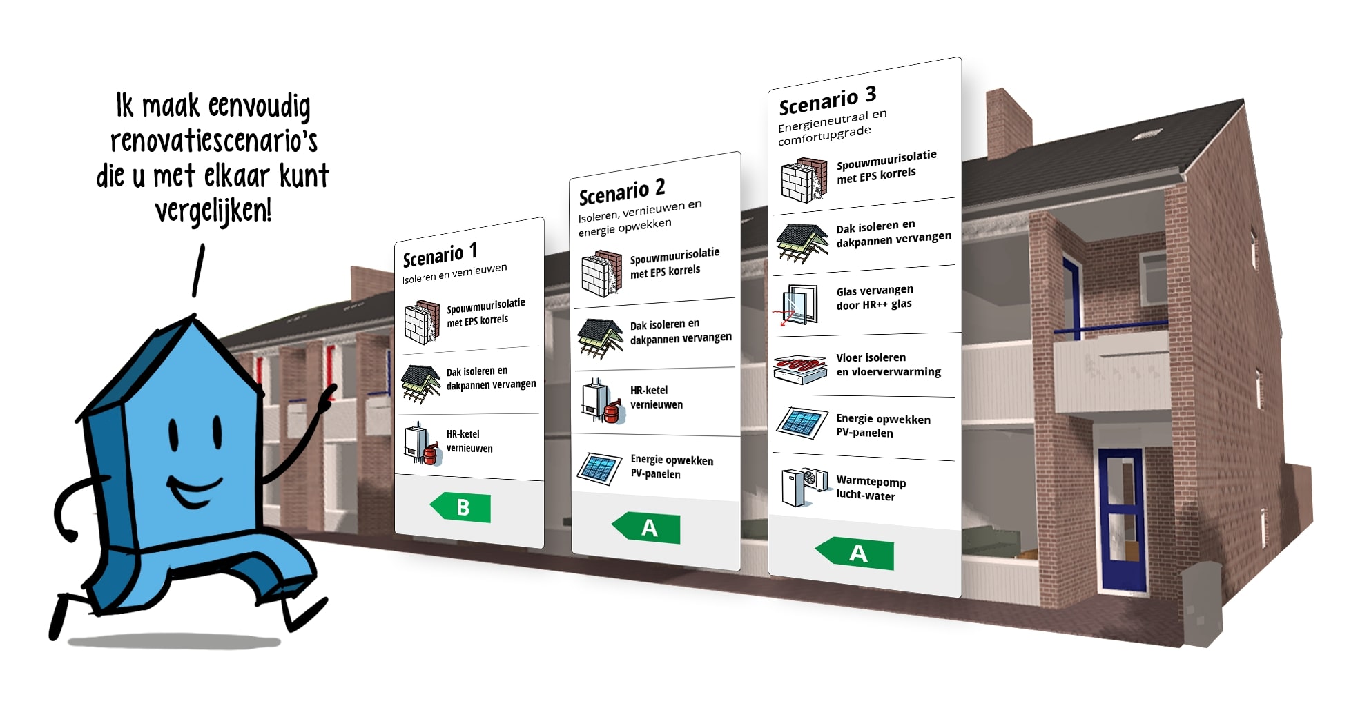Een mooi voorbeeld is de hulp die Smart Twin biedt bij renovatie en verduurzaming. Smart Twin kan namelijk precies laten zien welk veranderpotentieel wijken en woningen hebben. Daarbij wordt ook duidelijk wat de financiële en bouwtechnische consequenties zijn van bepaalde aanpassingen. Ook het effect op bijvoorbeeld het nieuwe energielabel en WWS-punten wordt hierbij direct inzichtelijk. Dit laat Smart Twin allemaal zien in overzichtelijke toekomstscenario’s. In ieder scenario wordt het MJOP automatisch aangepast. Door verschillende scenario’s met elkaar te vergelijken, kunnen woningcorporaties bepalen welke keuzes het meest gunstig en realiseerbaar zijn. Rekenwerk en inzet van adviseurs worden overbodig.