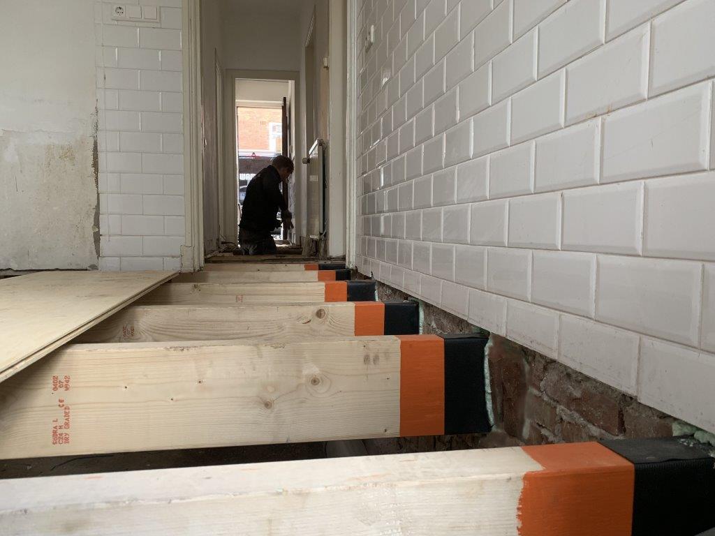 In samenwerking met de VvE (beheerder) is Zwamtotaal circa 25 beganegrondvloeren aan het renoveren in de Indische Buurt van Amsterdam. Tijdens kruipruimte inspecties is gebleken dat er in veel van deze woningen houten balken zijn aangetast door houtaantastende schimmels. Daarnaast zijn er in de kruipruimtes problemen geconstateerd zoals: optrekkend vocht, gecorrodeerd leidingwerk, rattenactiviteit en bouw- en sloopafval. De aanpak is volledig: we vervangen de aangetaste vloerdelen, we geven de stalen binten een goede opknapbeurt of vervangen deze indien nodig en we voeren rattenweringsacties uit. Nu de vloer toch open ligt controleren we gelijk het leidingwerk en vervangen we de gietijzeren riolering.